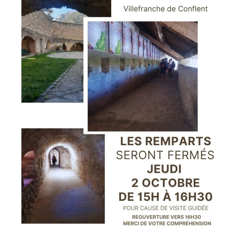 Nous vous informons qu’exceptionnellement les Remparts de Villefranche de Conflent seront fermés Jeudi 2 octobre de 15h à 16h30 pour cause de visite guidée.